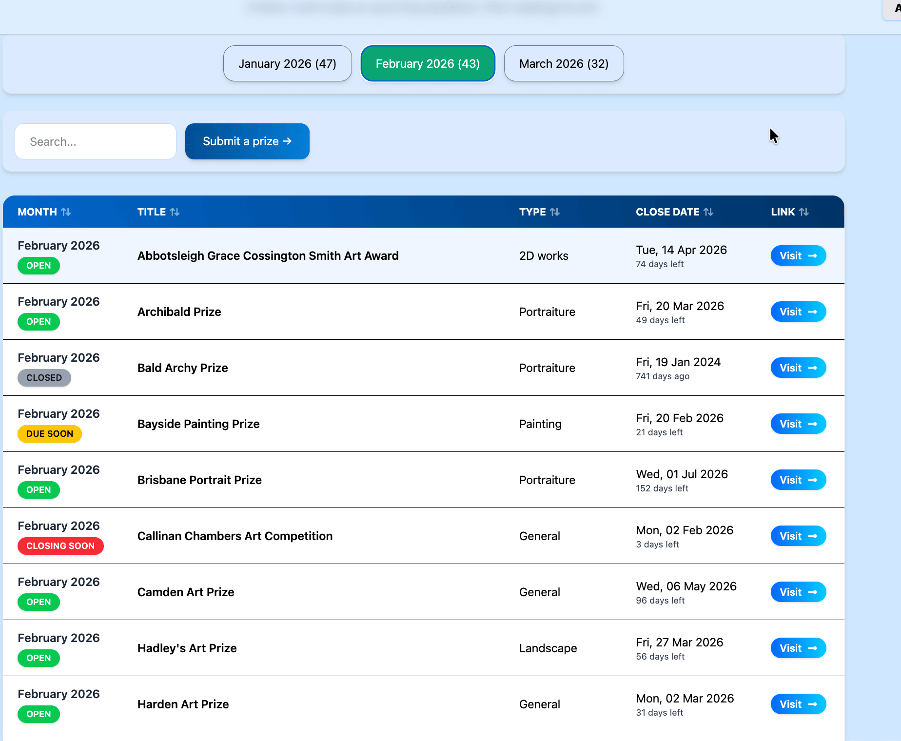 March 2026 Winners of the the free entry to the Stanthorpe Prize Thanks to the team at the Stanthorpe Art Prize we have been able to giveaway two free entries - congratulations to Cynthia Copely on winning the first giveaway congratulations to Shellie Cleaver on receiving the second giveaway. Prizes opening calls in the next 45 days There are heaps of prizes continuing their call in February (43 at last count) - but, these are the prizes to commence their 2026 call this month. Doyles Art...