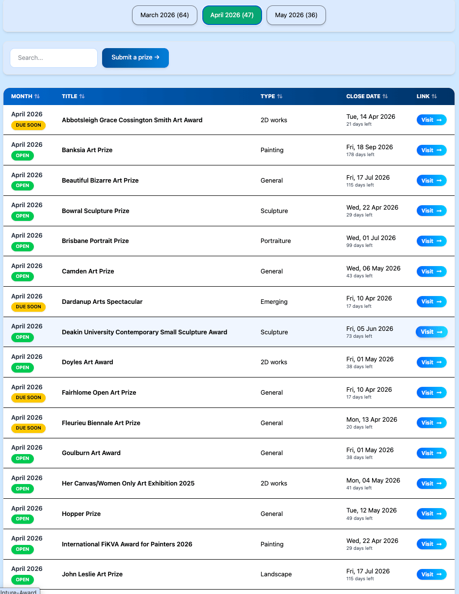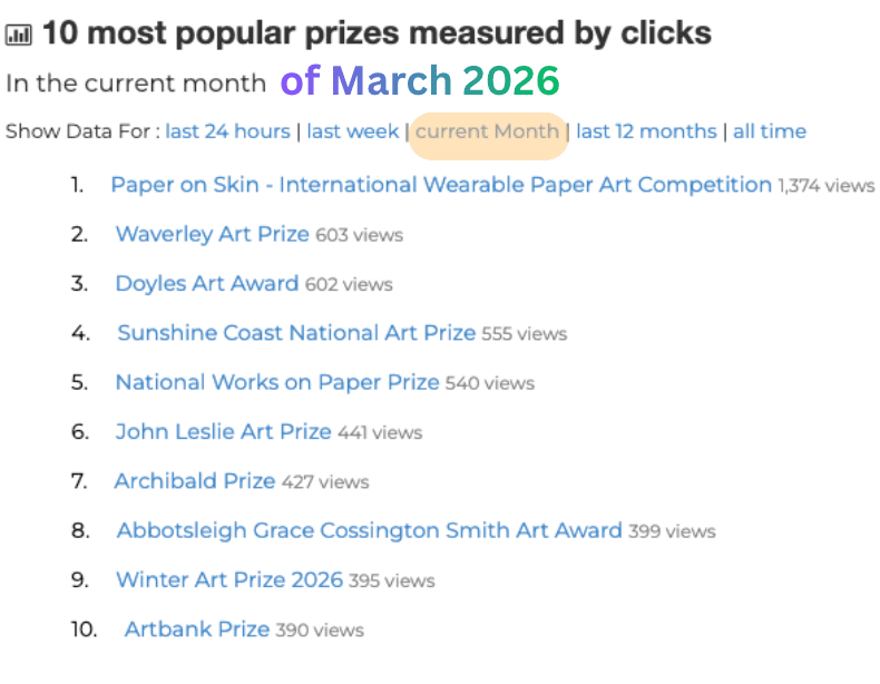 March 2026 Winners of the the free entry to the Stanthorpe Prize Thanks to the team at the Stanthorpe Art Prize we have been able to giveaway two free entries - congratulations to Cynthia Copely on winning the first giveaway congratulations to Shellie Cleaver on receiving the second giveaway. Prizes opening calls in the next 45 days There are heaps of prizes continuing their call in February (43 at last count) - but, these are the prizes to commence their 2026 call this month. Doyles Art...